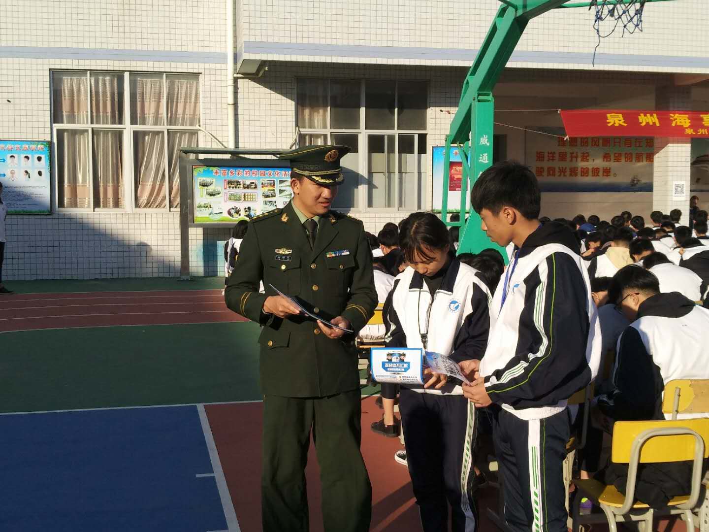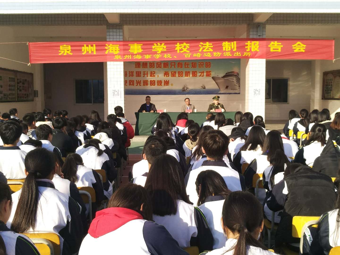 2018年1月15日下午第七节课,台商投资区百崎边防派出所民警走进泉州海事学校为广大师生带来了一堂生动有趣的法制教育课。泉州海事学校法制副校长、百崎边防派出所民警吴伟杰运用简洁易懂的语言、鲜活生动的案例为全校师生宣讲了消防安全、反电信网络诈骗等法律安全知识,民警们还现场分发了《反电信网络诈骗》等宣传材料。